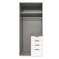 Kogu sarja mööbel on valmistatud kvaliteetsest mööbliplaadist ja saadaval erinevate viimistlustega. Kapp on nutikalt jaotatud kaheks, ülemises osas on riidepuutoru ja vaheriiul, paremal alumises osas neli sahtlit. Uksel olev peegel on praktiline ning lisab visuaalset avarust.