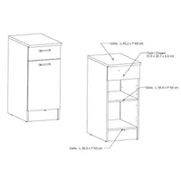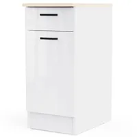 Ühe uksega alumine köögikapp on valmistatud kvaliteetsest melamiinkattega mööbliplaadist, mis on niiskus- ja kriimustuskindel. Pealmine plaat tamme imitatsioonis ning uksel ja sahtlil valge kõrgläige. Kapi ukse taga üks muudetava kõrgusega vaheriiul. Sahtel liigub metallsiinidel.