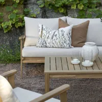 See stiilne komplekt sisaldab kahte tooli, diivanit ja lauda, mis on ideaalne nii tubase interjööri jaoks kui ka välitingimuste jaoks. Tooli mõõdud 70x75x78 cm, laua mõõdud 100x60x42 cm, diivani mõõdud 199x75x78 cm. Istmete kõrgus 42.5 cm, istmete sügavus 56 cm. Komplekt on valmistatud vastupidavatest materjalidest- mööbli raam on valmistatud FSC akaatsiapuidust ning istmeosad ning padjad on kaetud kvaliteetse kangaga. Komplekt ühendab vastupidavuse ja modernse disaini, pakkudes mugavust ja stiili.