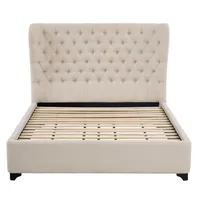 Voodi raam ja jalad on valmistatud vastupidavast puidust, tagades stabiilsuse ja pika kasutusea. Jala kõrgus8 cm. Beežis toonis kangas toob ruumi soojust ja elegantsi ning sobitub hõlpsasti nii klassikalise kui ka kaasaegse sisekujundusega. Voodipõhi kuulub komplekti.