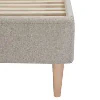 Voodi raam on valmistatud vastupidavast männipuidust, mida täiendab meeldiva tekstuuriga kangaskate. Loomulikust täispuidust jalad lisavad voodile stabiilsust ja naturaalselt sooja ilmet. Voodi laius koos peatsiga on 183 cm, voodiraami laius on 169 cm, raami kõrgus 33 cm. Voodilipid kuuluvad komplekti.