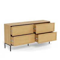 Neli raamitud sahtlit avanevad mugava push-to-open süsteemiga ning on ääristatud dekoratiivsete liistudega, mis loovad elegantse ja šiki esipaneeli. Mustad kandilised terasjalad annavad kummutile visuaalselt kerge ja modernse ilme. Pealmise plaadi maksimaalne kandevõime on kuni 40 kg. Jala kõrgus 18 cm.