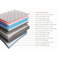Karkass on valmistatud mööbliplaadist, puidust ja laminaadist. Kaetud on see vastupidava mööblikangaga. Madrats on varustatud 18 cm kõrguse pocket-vedrustusega, kus iga vedru on eraldi kangast taskus. See tagab keha täpse toetuse, vähendab liikumise ülekandumist. Vedrustuse mõlemal poolel on pehmed vildikihid, mis kaitsevad vedrusid ja pikendavad madratsi kasutusiga. Mugavuse ja toestuse loovad mitmekihilised vahud- elastne vaht (22 DN) annab stabiilsuse ja vastupidavuse ja pehmem vaht (14 DN) lisab pehmust ja surveleevendust. Madratsi kattematerjaliks on kašmiirkangas, mis on nahasõbralik, hingav ja luksusliku tunnetusega. Kihtide vahel kasutatud termokiud parandab õhuringlust ja aitab hoida madratsi kuiva ning värskena. Voodil on mahukas pesukast, mis pakub mugavat ja praktilist hoiuruumi voodipesu, tekkide ja patjade jaoks. Jalad 10 cm kõrged.
