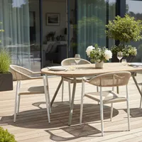 Kaasaegne aiatool ühendab endas kerguse, vastupidavuse ja ajatu disaini. Tooli valge alumiiniumraam on tugev ja sobib suurepäraselt välistingimustesse, olles samal ajal kerge ning lihtsasti liigutatav. Iste ja seljatugi on kaetud punutud PE materjaliga, mis lisab toolile naturaalset ilmet ja tagab mugava istumiskogemuse. Istme kõrgus 45 cm, istme sügavus 45 cm. Maksimaalne kandevõime kuni 110 kg. Pehmelt kaarduv seljatugi toetab hästi selga ning muudab tooli sobivaks nii söögilaua äärde kui ka lõõgastumiseks terrassil või aias.
