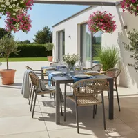 Kaasaegne aiatool ühendab endas kerguse, vastupidavuse ja ajatu disaini. Tooli tumehall alumiiniumraam on tugev ja sobib suurepäraselt välistingimustesse, olles samal ajal kerge ning lihtsasti liigutatav. Iste ja seljatugi on kaetud punutud PE materjaliga, mis lisab toolile naturaalset ilmet ja tagab mugava istumiskogemuse. Istme kõrgus 45 cm, istme sügavus 45 cm. Maksimaalne kandevõime kuni 110 kg.