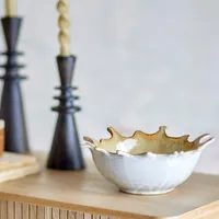 Bloomingville Alcott kauss on valmistatud kivikeraamikast ning eristub oma iseloomuliku vormi ja kauni reaktiivglasuuriga, mis annab pinnale elava ning käsitöö hõngulise ilme. Kauss sobib suurepäraselt nii serveerimiseks kui ka dekoratiivseks detailiks interjööris, lisades ruumile loomulikku soojust ja stiili.