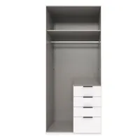 Kogu sarja mööbel on valmistatud kvaliteetsest mööbliplaadist ja saadaval erinevate viimistlustega. Kapp on nutikalt jaotatud kaheks, ülemises osas on riidepuutoru ja vaheriiul, paremal alumises osas neli sahtlit. Uksel olev peegel on praktiline ning lisab visuaalset avarust.