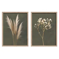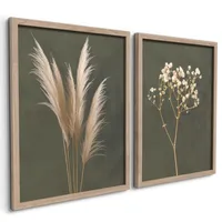 See kahest pildist koosnev komplekt toob interjööri rahuliku ja looduslähedase meeleolu. Piltidel kujutatud õrnad taimed ja kõrrelised loovad elegantse ning tasakaalustatud kompositsiooni, mida täiendab sügav roheline taust. Naturaalset tooni raamid lisavad piltidele soojust ja sobituvad kaunilt erinevate sisustusstiilidega. Ühe pildi suurus 30x40 cm.