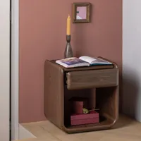 WOOOD Elura öökapp lisab magamistuppa sõbraliku ja rahustava ilme. Ümarad nurgad ning õhuline disain loovad tasakaalustatud üldmulje, mis sobitub kergesti erinevate sisustusstiilidega. Soe pruun toon ja nähtav puidusüü annavad mööblile loomuliku iseloomu ning muudavad iga eseme visuaalselt ainulaadseks.