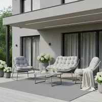 Luksusliku stiiliga pilkupüüdev aiamööbli komplekt, mis võlub igat vaatajat ning muudab värskes õhus viibimise veelgi nauditavamaks. Halli viimistlusega mööbel sobib nii aeda, terassile kui ka tuppa. Helehallid kohevad ja mugavad istumispadjad mõjuvad lõõgastavalt ja loovad reserveeritud stabiilse tunde. Rotangmööbli komplekti kuulub kahekohaline diivan, kaks tugitooli ja aialaud.